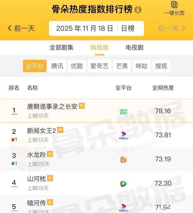 目前电视剧热度榜,《新闻女王2》排名第2,第一热度高达78.41,你最爱哪部?